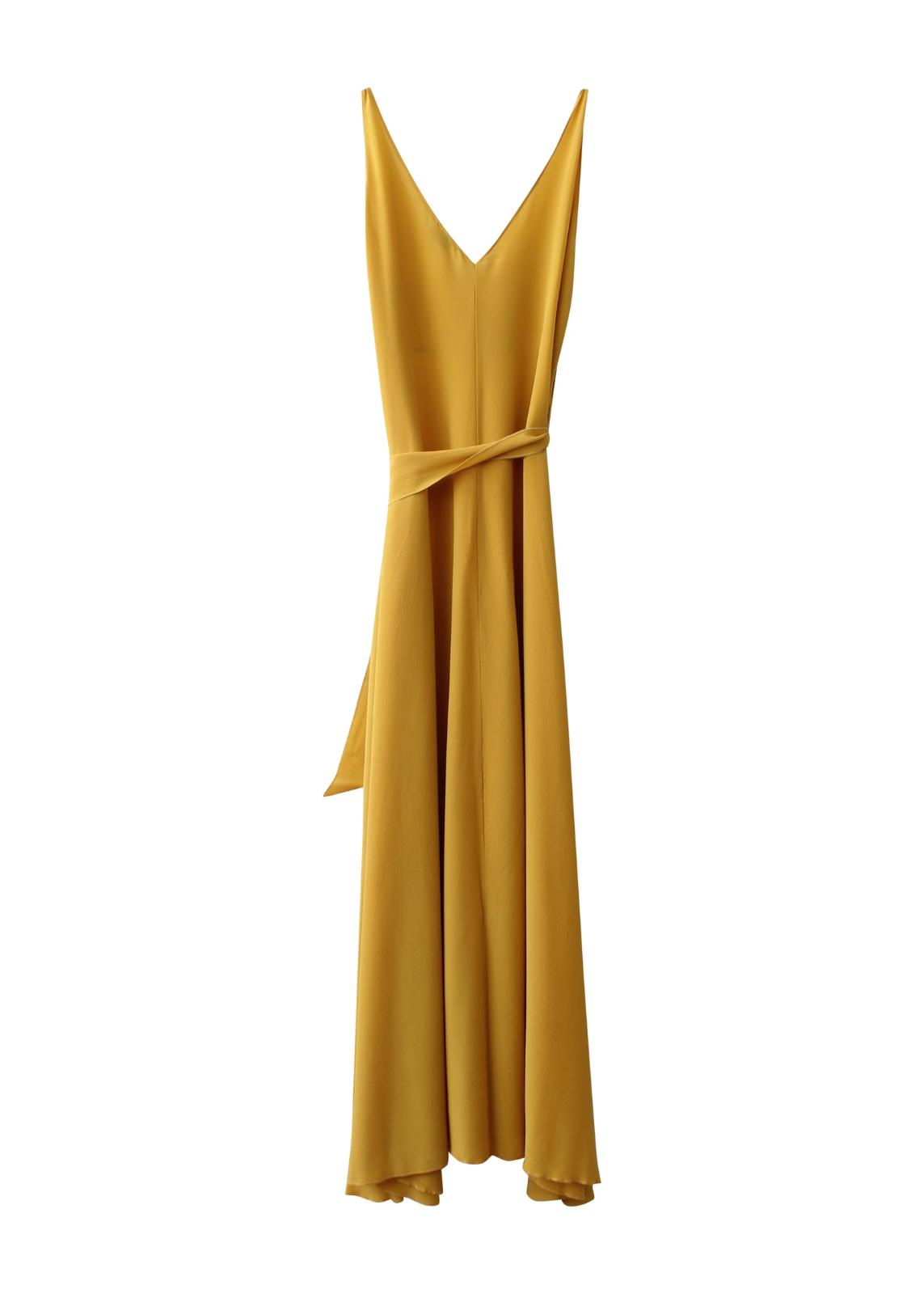 Abito in seta lungo con spallina stretta. Fusciacca in vita scollo a V davanti e dietro. Vestibilità regolare.