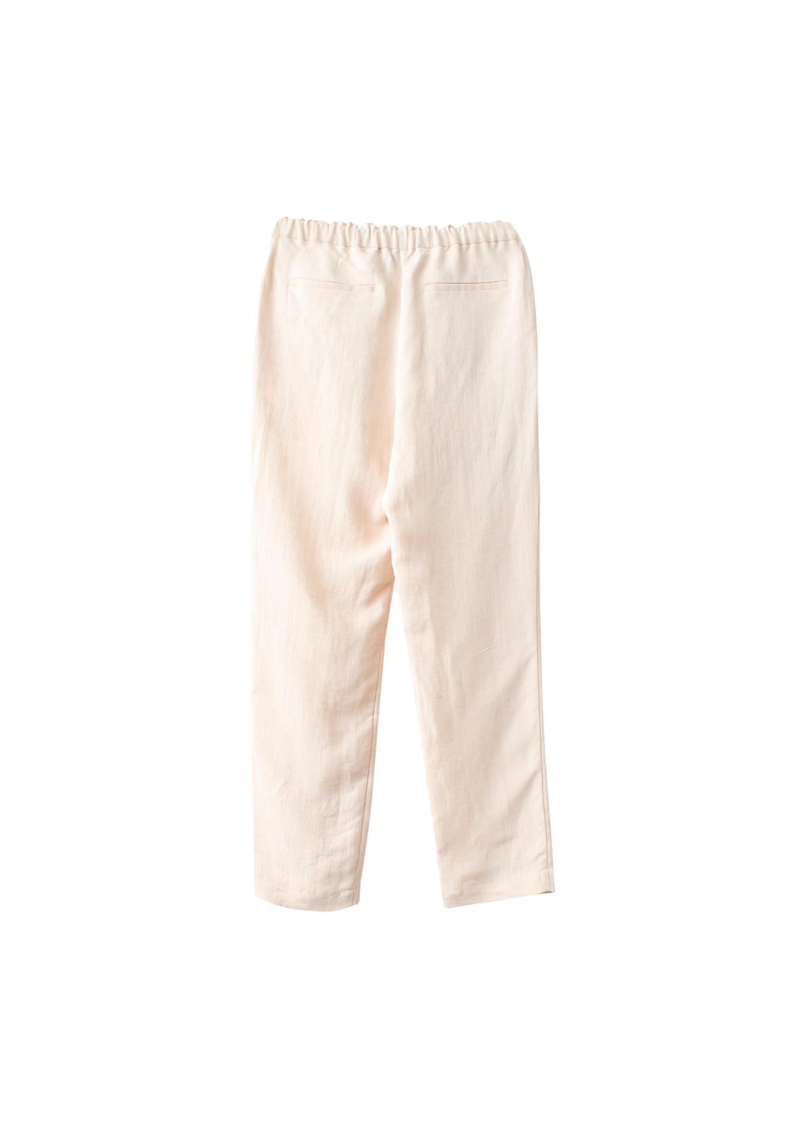 Pantalone in viscosa lino con elastico in vita, tasche laterali e sul retro a filo. Vestibilità over.