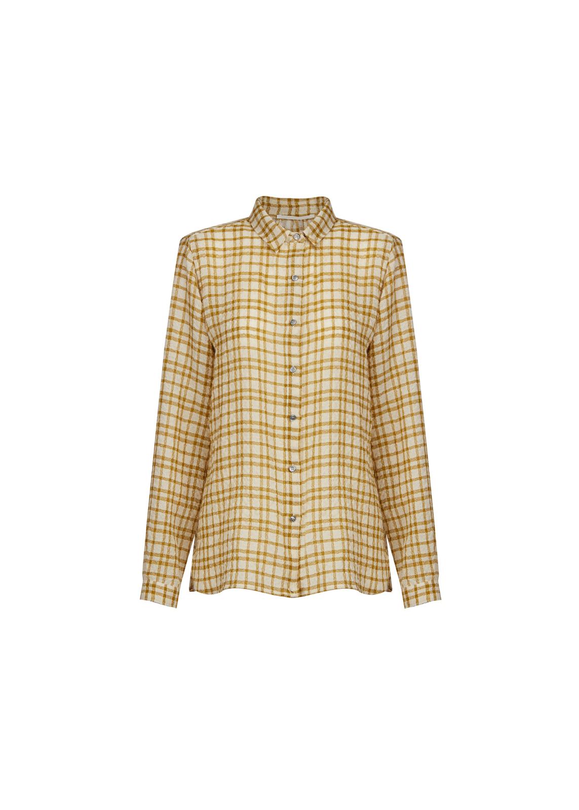 Shirt with long sleeves, classic collar and button fastening . Sleeves end with cuff and button. Can be worn with front or side fastening.