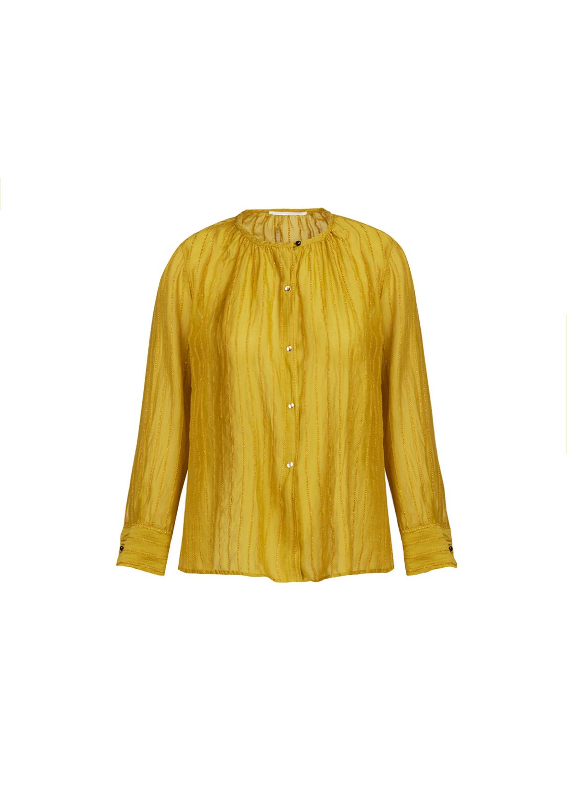 Shirt with long sleeves. Mandarin collar, frontal fastening with jewel button on the top. Little slits on both sides.