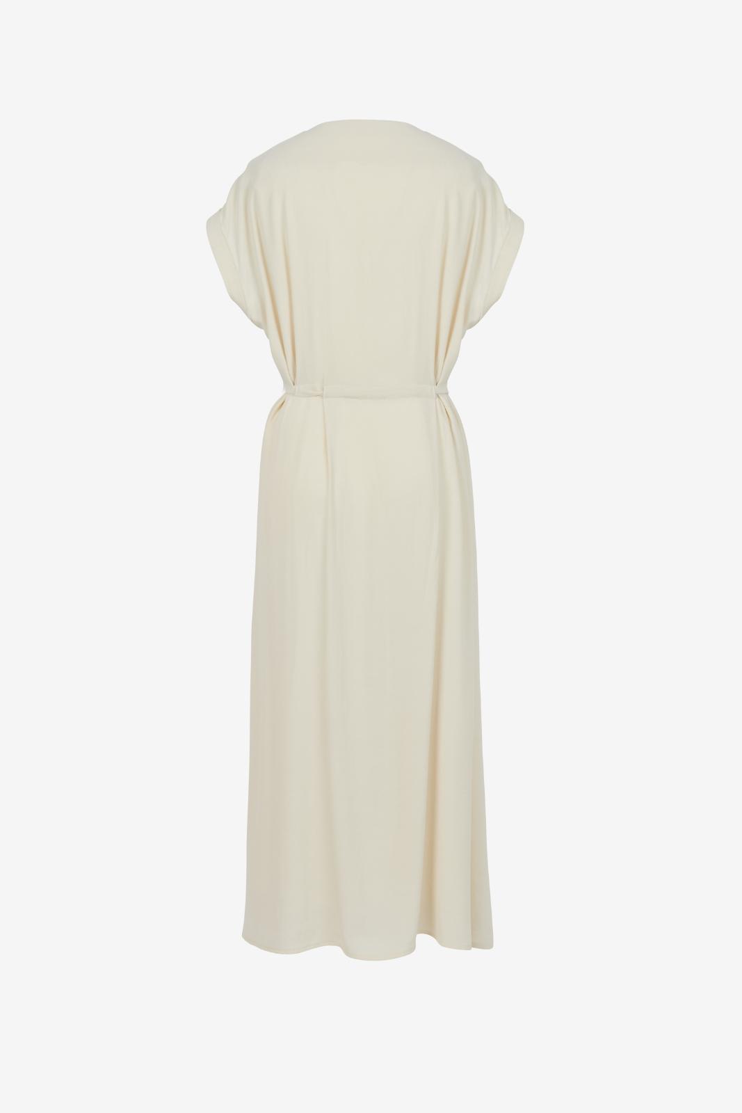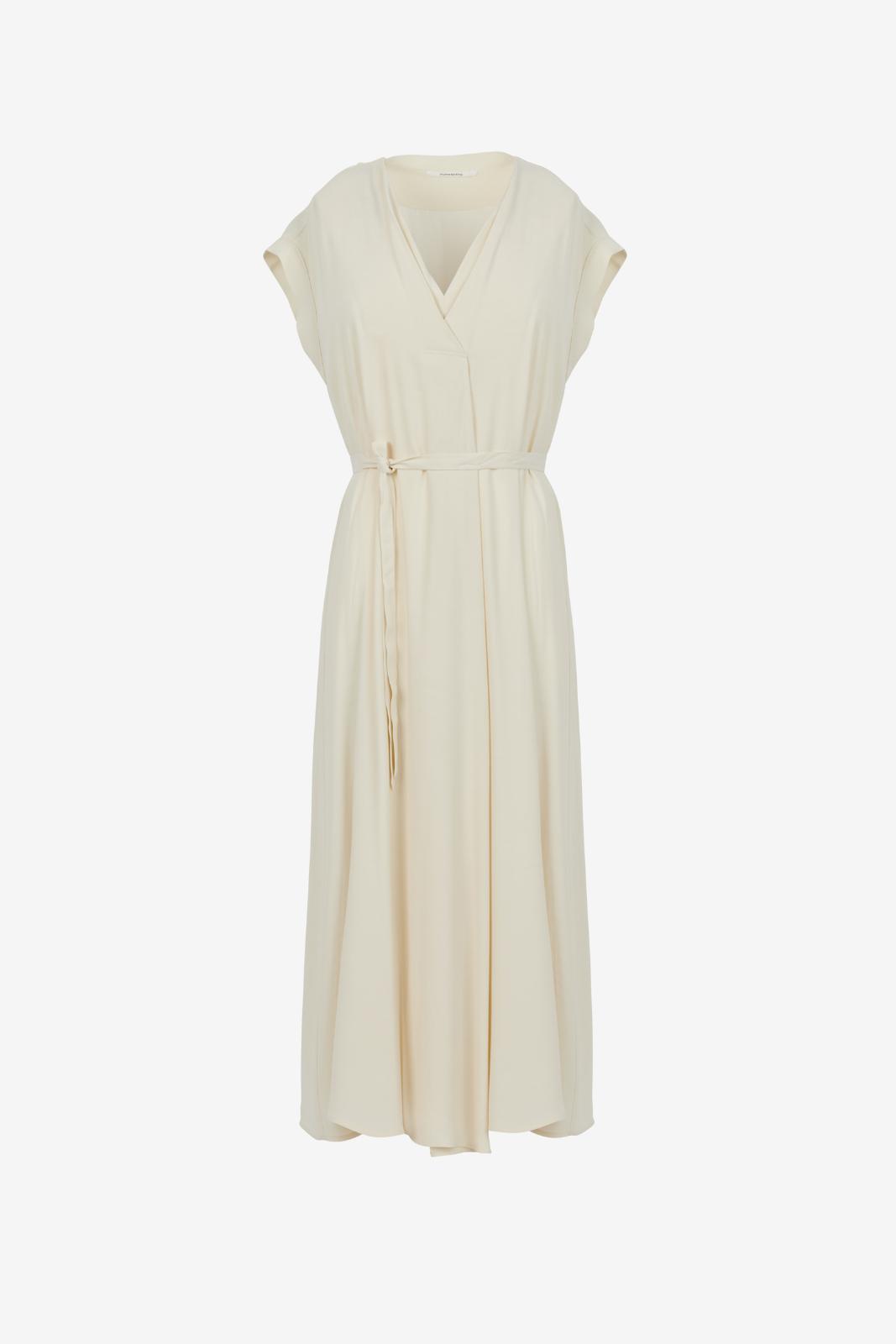 Long dress with V neck in woven viscose. Short sleeves, fabric belt at the waistline, skirt's comfortable fitting.