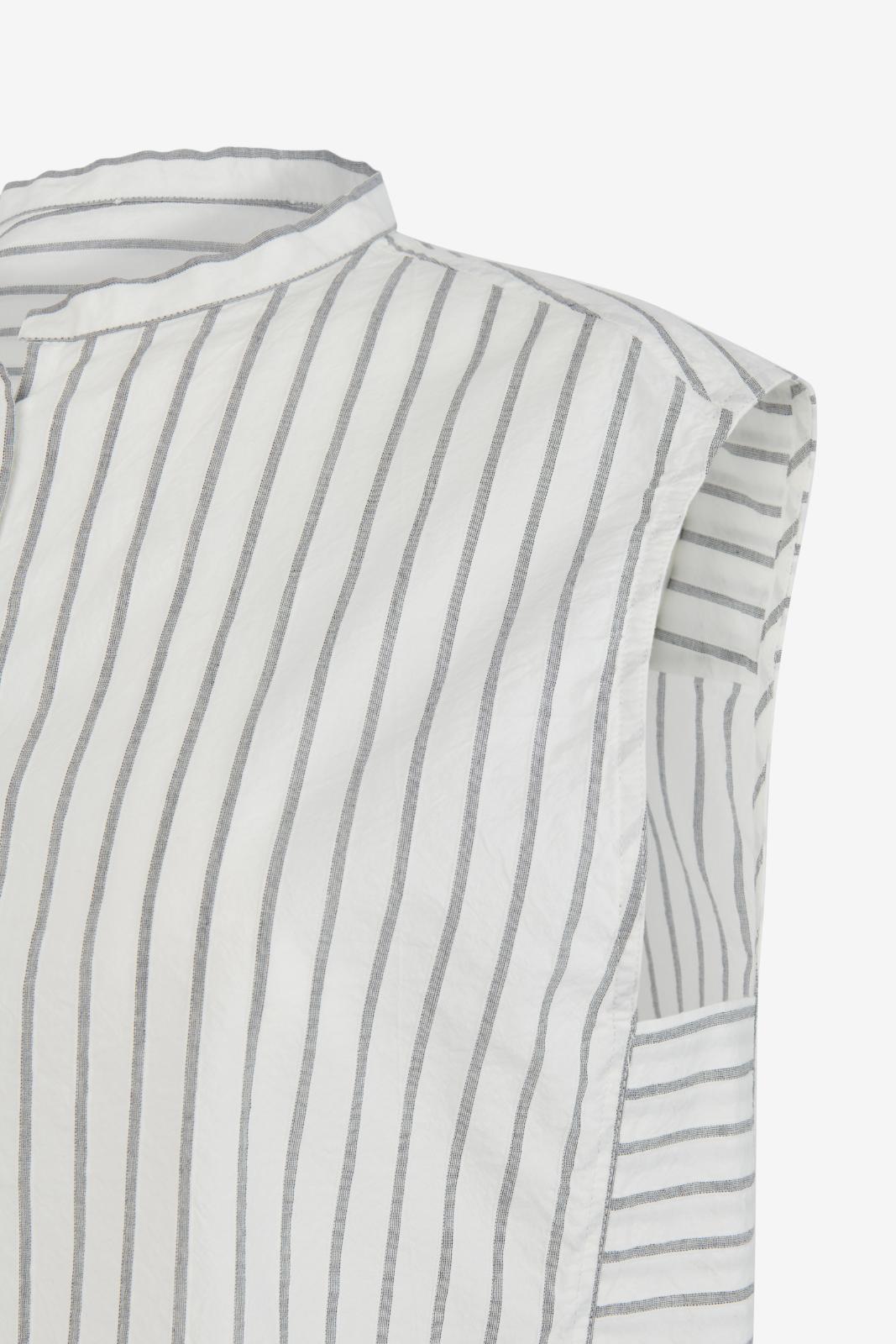 Sleeveless shirt in striped linen cotton polin. Stand-up collar, frontal fastening with mother-of-pearl buttons, round hem.