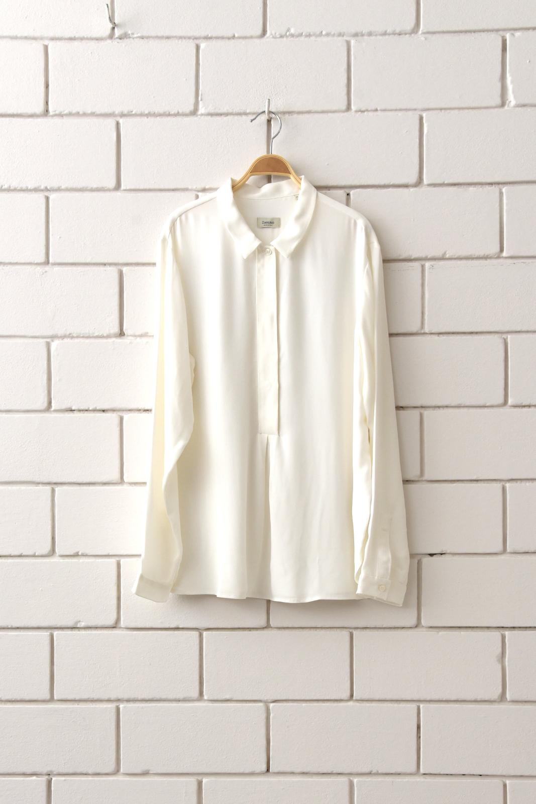 Camicetta con colletto tipo polo e manica lunga. Orlo con spacchi laterali.